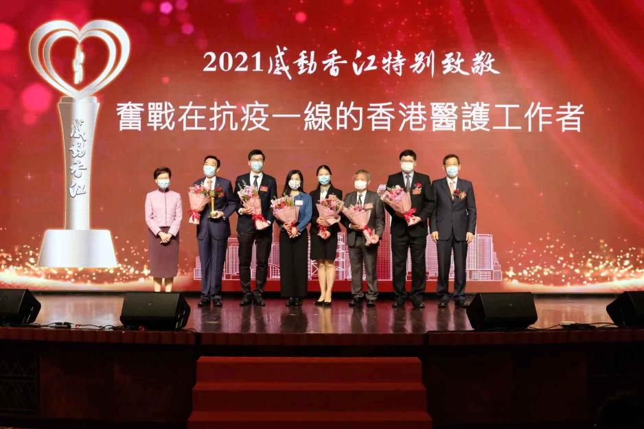 抗疫醫護獲得“2021 感動香江特別致敬”獎。圖源:大公文匯全媒體 本次共頒發4個“2021感動香江團體獎”、8個“2021感動香江人物獎”,並向奮戰在抗疫一線的香港醫護工作者頒發“2021感動香江特別致敬獎”。 榮獲“2021感動香江團體獎”的分別是:香港警隊、東京2020奧運會中國香港代表團、東京2020殘疾人奧運會中國香港代表團以及中國建築工程(香港)有限公司全體施工團隊。 榮獲“2021感動香江人物獎”的分別是:香港首位當選中國科學院院士的科學家支志明教授、為國家航天事業發展貢獻“香港智慧”的容啟亮教授、奔赴抗疫前線的韋玉珍醫生、“黑暴”肆虐時以筆為劍的作家屈穎研、香港單親協會總幹事余秀珠、撐警的“14億人茶餐廳”老板娘李凱瑚、以行動支持環保發起“上山下海執垃圾”群組的洗力求,以及大灣區創業先行者魏嘉俊。 林鄭月娥致辭時表示,香港現在的良好局面得來不易,除了中央支持外,也有無數人在香港面對困難時挺身而出。她稱贊香港警隊、抗疫醫護人員及香港運動員獲得“2021感動香江”獎項是實至名歸,值得港人致敬,期望這些被表揚的人和事,可以啟發新一代,傳承引以為傲的香港精神。 香港大公文匯傳媒集團董事長姜在忠表示,香港近年出現“黑暴”事件令社會動蕩,亦讓外界質疑“香港變了嗎?”本次主辦評選活動就是希望向香港社會、內地以及世界各國證明,香港從來不缺正能量。 香港特區政府政務司司長李家超、中央駐港維護國家安全公署副署長李江舟、外交部駐港特派員公署副特派員潘雲東等逾140位嘉賓出席典禮。 【編輯:馬華】