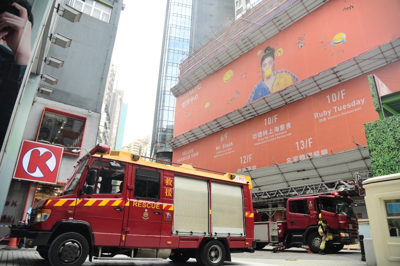 (銅鑼灣火警有傷者送院治療 攝影:香港中通社記者 許其皓) 當日下午12時37分世貿中心發生火警,並於下午1時3分升為三級火警。消防人員正動用兩條喉和兩隊煙帽隊灌救。 (香港中通社記者火警現場直擊) 據悉,涉事商場外牆被棚架包圍,場地內冒出濃煙,約有百名被困人士在平台等候救援,消防人員多次升起雲梯救出被困人士。