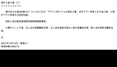 香港新聞網12月15日電 香港灣仔告士打道280號世貿中心15日下午發生3級火警,火警中有至少 6 名女子送院,年齡介乎 30 至 70 歲,主要因為吸入濃煙不適,其中 1 人送院時半昏迷。 由於該大廈正進行大型裝修工程,大量濃煙由外牆棚架中湧出。警方指,初步調查是棚架先起火。