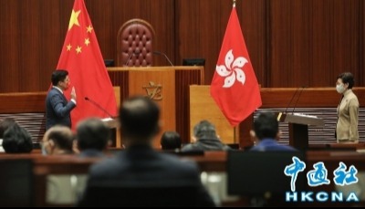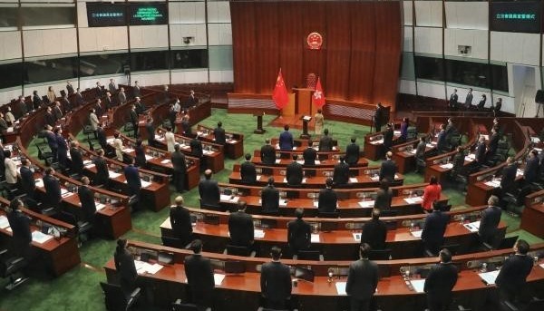香港立法會90位議員在國徽下國旗區旗前宣誓