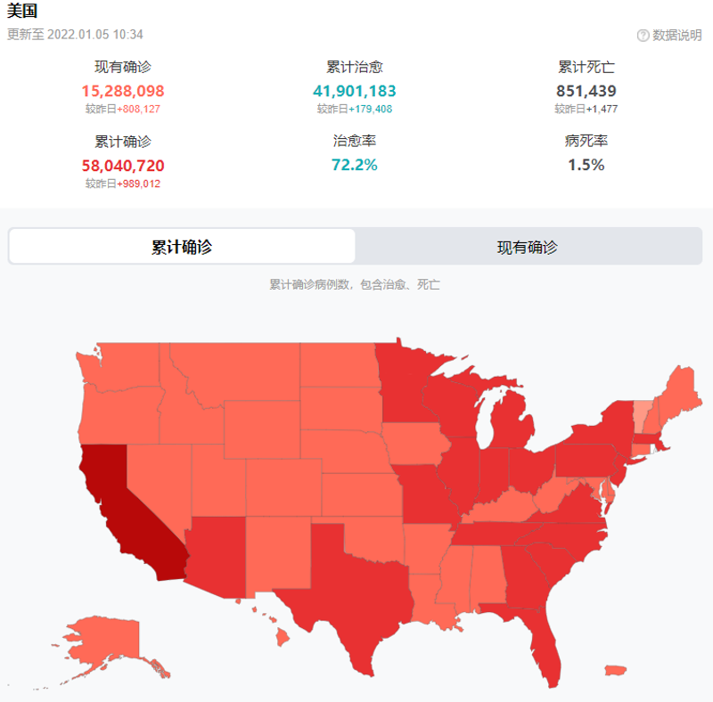 香港新聞網1月5日電 奧密克戎變種病毒令全球新冠疫情海嘯式蔓延,美國本周一單日新增確診人數達到108萬宗,是疫情爆發兩年多以來,全球首見單一國家單日破百萬宗確診。這個數字是4天前的兩倍,足見疫情急劇惡化的程度。