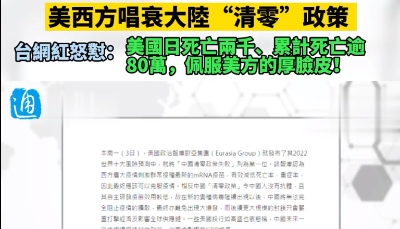(BBC報道截圖) 昨日,BBC中文網“搬運”美國政治風險諮詢公司歐亞集團(Eurasia Group)的所謂“報告”,聲稱“將中國新冠清零‘失敗’為2022年全球十大風險第一位”。 BBC中文網引述該報告,聲稱中國的“清零”政策在2020年 “看上去取得成功”,但中國人口對Omicron(奧密克戎毒株)幾乎沒有抗體。”面對奧密克戎在全球多國肆虐的情況,該報告“斷言”,“封鎖兩年使得重新開放(邊境)對中國的風險更大”。 基於此“分析”,報告得出一個令人啼笑皆非的結論——“中國的政策將無法遏止病毒傳播,帶來更大規模暴發,因而需要更多嚴格的封鎖”,又預測中國取消嚴格封鎖的情況要在2022年底才能實現,因此中國經濟將受到“影響”,並繼續給中國潑髒水,聲稱這“也將增加全球供應鏈的問題,並帶來通貨膨脹壓力……” 在唱衰中國防疫政策的同時,美國諮詢公司炮製的所謂“報告”卻“看好”歐美國家的防疫政策。 這份報告“迷之樂觀”地“預言”:等到富裕國家人口大多完成mRNA疫苗加強針接種後,“發達國家的疫情將接近尾聲”。 然而諷刺的是,就在該美國公司“積極”預測中國的所謂“風險”、BBC忙著搬運所謂“報告”的時候,美國的單日新增確診病例數已破百萬,刷新全球紀錄;英國等西方國家的確診病例也在不斷增長,創下歷史新高。 這些不幸被疫情席捲的國家,不少是這份所謂“報告”裡提及的“疫情將接近尾聲”的發達國家! 對於BBC報道的這份所謂“報告”,一些早已熟悉BBC抹黑中國套路的網友表示“笑笑就好”,但也有網友憤怒地說,西方媒體此舉實在“無恥”。 “西方這是多麼盼望中國的防疫政策是錯的,來靠這個去證明自己是對的?”有網友直言,西方國家“因為自己的無能,死了快一百萬人,就是不承認自己是錯的!”“日感染100萬人不是風險,日死亡3000人不是風險。反而中國清零政策是風險?這要多無恥才能做出這種分析!” 有網友反問,按照西方的邏輯,“中國只有跟西方國家一樣就沒有風險了?” 還有網友一針見血地指出,中國嚴格的防疫政策,致使防疫不力的西方國家遭受了損失,因此他們才氣急敗壞地攻擊中國。“你們太依賴中國了,就是你們口中的風險。”
