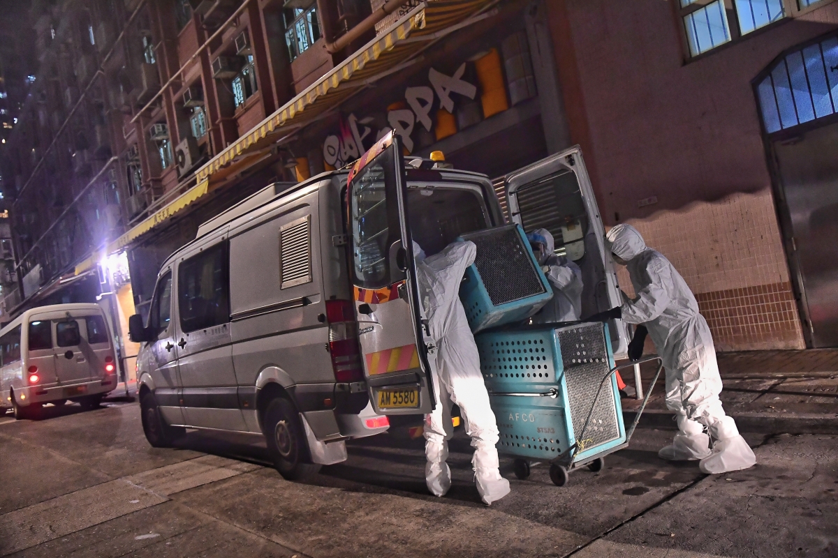 工作人員使用籠子將住戶家中的寵物一起帶離撤離。(香港中通社記者 許其皓攝) 截至目前香港已有兩例本地源頭不明個案,包括早前確診的超市理貨員,病毒基因排序與國泰空姐相同,但未找到染疫關連;另一宗為9日初步確診的是一名未接種疫苗的20歲銅鑼灣SOGO崇光百貨前兼職售貨員,未知感染來源。她與家人同住掃管笏愛琴海岸8座,並於銅鑼灣崇光擔任兼職售貨員,去年12月28日最後上班。