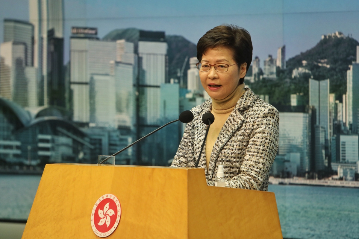 香港特首林鄭月娥 (香港中通社記者 謝光磊 攝) 現時社交距離防疫措施,包括食肆下午6時起禁堂食、健身中心等15類表列處所需要繼續關閉等。 【編輯:王軼南】