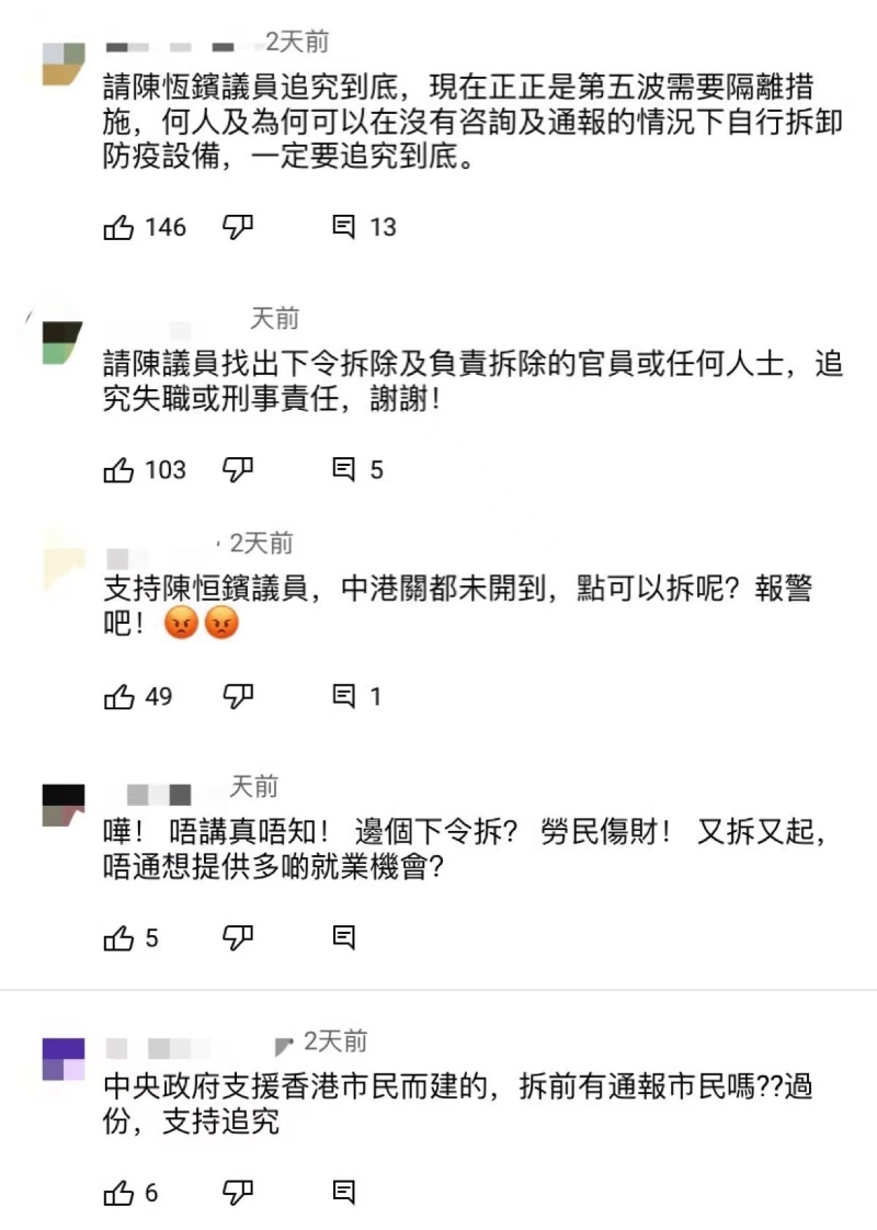 (圖源:中新社) 早前,香港醫院管理局已重啟亞洲國際博覽館(以下簡稱亞博館)的社區隔離設施,以應付日益增加患者的病床需要。對此,立法會議員陳恒鑌在接受網媒訪問時認同重啟亞博館很有必要。他指出, Omicron(奧密克戎)的傳播力驚人,因此增加隔離設施需要有負壓設備,才不會令醫治的地方有交叉感染的情況。亞博館空間大、人煙少是理想場所。 他還建議,亞博館還有很多個館,要增加近6000個位置,“不是沒有可能”。 不過,陳恒鑌亦提到,了解到亞博館內的一些中央援建的防感染設施,早前已經被拆除。 “這是很嚴重的疏忽!”陳恒鑌強調,雖然當時香港第四波疫情已經平復,但外國疫情仍在不斷暴發,香港不時有外國輸入的零星個案。他說,防疫要有預備的心態,全世界未“清零”的時候,都不能將檢疫設施貿然拆除。 他直言“這些是中央援建香港的設施,在不知情況的情況下將這些設施拆除,是不負責任的行為。”並透露會考慮在立法會質詢,“因為這是很嚴重的過失” 。 2020年10月,中央政府支援香港在亞博館增建了包括病床隔間、負氣壓設施、醫療站、空調和空氣過濾系統等社區治療設施,由香港醫院管理局正式接收。據悉,建造工程團隊於8至11號展館增建接近1000張病床,部分備有負氣壓設施,連同亞博館1及2號展館早前已設有的900張病床的社區治療設施,大大提升了香港應對疫情的能力,減輕了公立醫院的壓力。 中央支援香港抗疫的舉動既是對香港抗疫的支持,亦顯示出國家對香港的關愛。因此,中央援建的館內防疫設施被“靜悄悄”地拆除的消息曝光後,不少香港網友“不淡定”了! 在相關新聞的評論區,有網友表示,若非陳恒鑌議員説出來,香港市民都不知道此事,質問“是誰下令拆除?勞民傷財!”還有網友不滿地說,亞博舘內的防疫設施是“中央為支援香港市民而建的,拆前有通報市民嗎?” 對於陳恒鑌表示將在立法會質詢此事,網友們紛紛表示“支持”,呼籲一定要對相關人士“追究到底”。