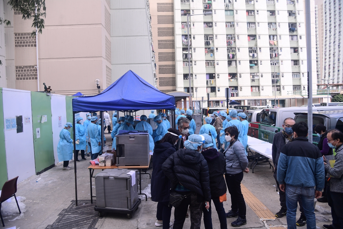 香港屯門大興邨興泰樓圍封強檢現場。(香港中通社記者 許其皓攝) 過去兩周本港累計有1921宗個案,其中不明源頭個案超過320宗。郭健安指,若以1人可傳染給另外4人推算,到第五代傳播會造成近千人感染,若港府短期內無法追蹤密切接觸者,疫情或更難“見頂”。 他認為,現時“圍堵”政策可幫助市民“買時間”接種疫苗,減少一旦感染後的死亡和重症比率,呼籲長者盡快接種,其他人亦應盡快打第三針。 公務員事務局局長聶德權在社交網站公布,截至周日超過539萬人已接種第一針新冠疫苗,接種率達8成。聶德權形容成績得來不易,但不足以抵禦急劇惡化的疫情,要盡快提升接種率至9成。 食物及衞生局局長陳肇始今日(7日)表示,本港Omicron個案以幾何級上升的趨勢已開始,會積極考慮再收緊社交距離措施,大方向是減低人流,明日(8日)行會後將有公布。 陳肇始在港台節目《千禧年代》說,正積極考慮再次收緊社交距離措施,大方向是要減低人流,直言是內防擴散工作的重要一環,呼籲市民留家抗疫、盡快接種疫苗、如收到風險通知應盡快檢測,僱主亦應盡量安排員工留家工作。
