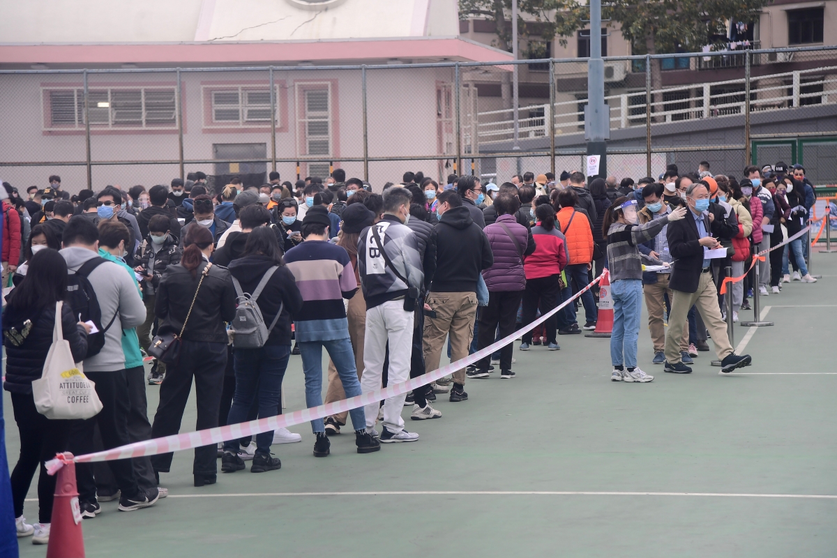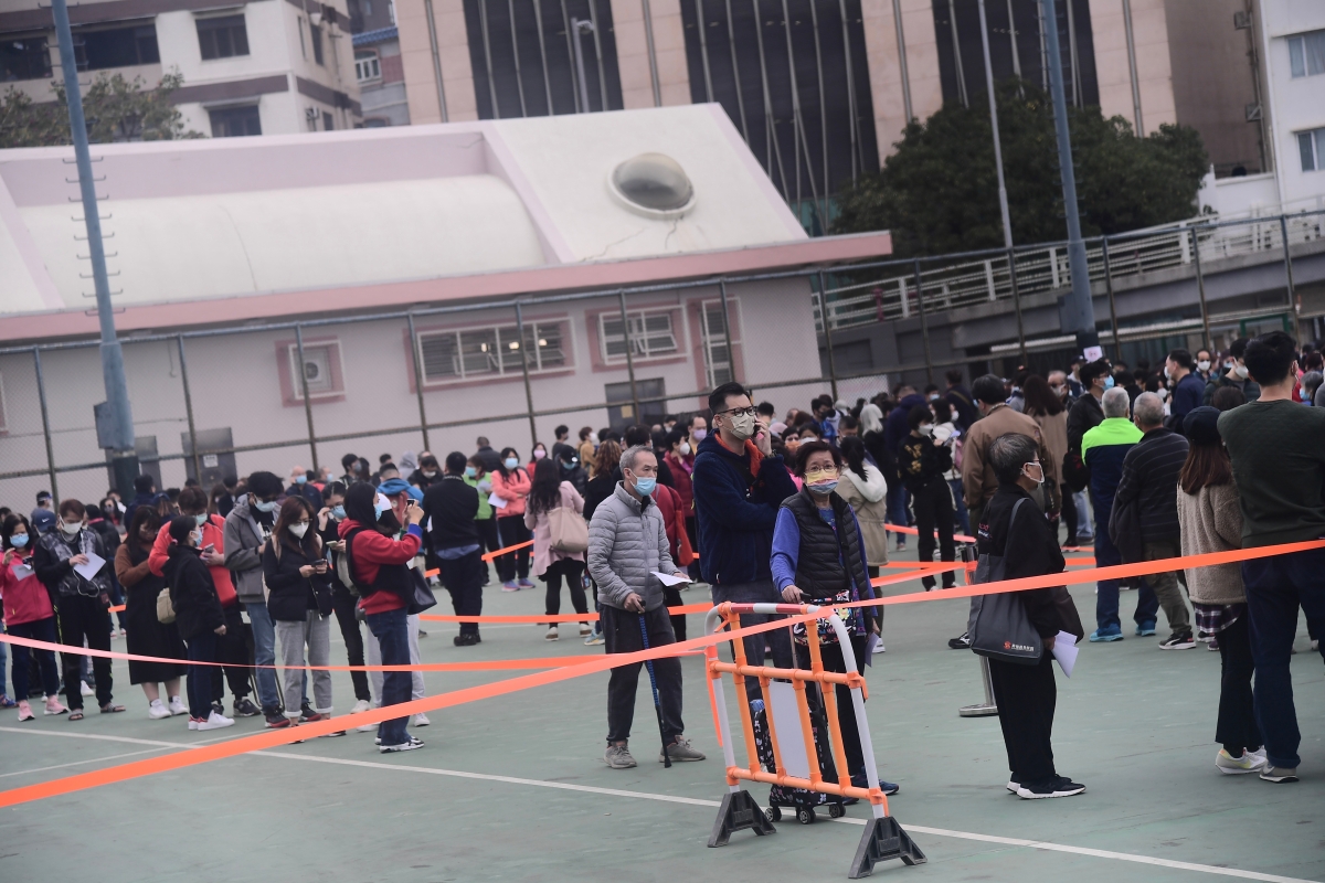當日,多區社區檢測中心、流動採樣站均爆滿,位於土瓜灣體育館的檢測中心已不再接受入場排隊。(記者 王豐鈴)