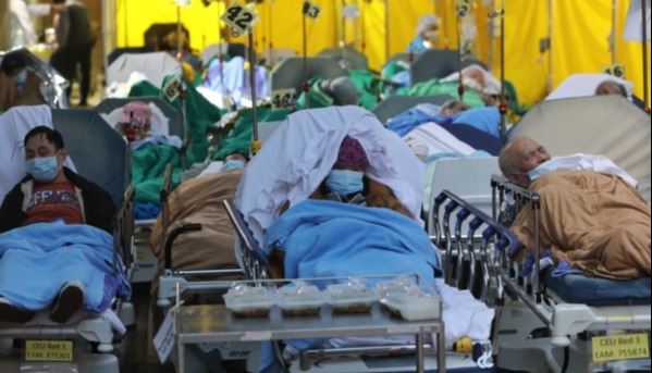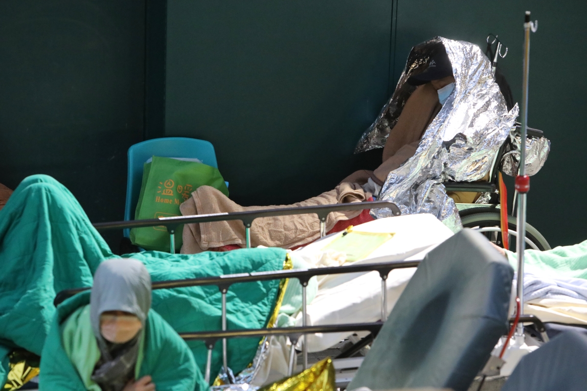 香港中通社圖片 近日,香港多間醫院在戶外空地搭建帳篷及病床供染疫患者使用,休憩處和停車場亦劃成隔離設施。 記者注意到,16日下午,候診病人中大多是長者。由於近日氣溫驟降,他們身著厚衣躺在戶外病床上,配戴口罩,蓋著毛毯;旁邊的帳篷內也有家長抱著幼兒等待。有關情況至17日仍未明顯改善,據媒體報道,仍有數十位病人在等待入院。 香港病人政策連線主席林志釉認為,醫院在空地架設帳篷讓染疫病人候診的情況不理想也不安全,應安排確診者先留在室內,待醫院有病房再前往候診。