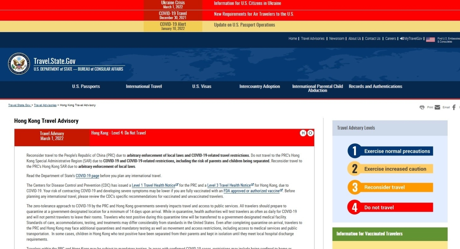 美國提升對香港旅遊警戒籲國民勿前往 美國國務院網頁截圖 美國疾控中心指,香港疫情出現非常高感染風險,國民應避免前往香港,又指即使已完成接種疫苗,並注射加強劑,仍有感染及散播新冠病毒的風險。 美國疾控中心建議兩歲或以上的民眾在室內地方應佩戴口罩,並遵守香港的防疫規定,又指從香港返回美國的民眾,應在抵達美國後三至五天內,接受新冠病毒檢測,如未接種疫苗或未注射加強劑,應在家自我隔離五天。 【編輯:王軼南】