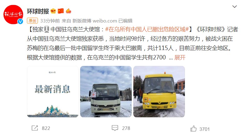 環球時報微博截圖 據《環球時報》報道,被戰火困在蘇梅的最後一批中國留學生共計115人,經過各方的艱苦努力已於當地時間周二(8日)晚9時許乘大巴撤離,目前正前往安全地區。第7架接返自烏克蘭撤離中國公民臨時航班今日(9日)安全抵達甘肅蘭州。 使馆表示,至此在乌所有中国人已经撤出了乌克兰的危险区域。