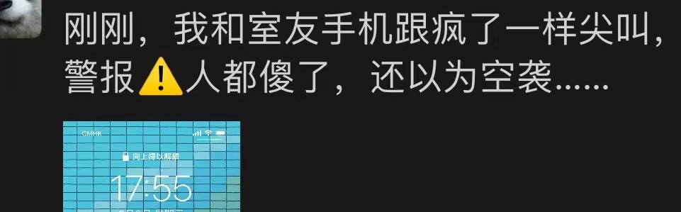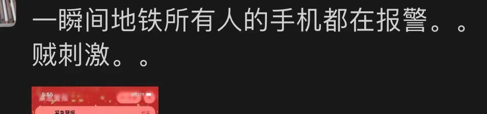 有正在乘搭地鐵的市民表示:“一瞬間所有人的手機都在響,這場面賊刺激”,也有市民收到提示後“發了瘋一樣尖叫,還以為是空襲”。可見這條信息讓市民多震驚。