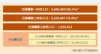 香港公務員事務局局長聶德權11日在同一場合透露,第五波疫情死亡個案超9成未接種或未打完兩針疫苗,接種兩劑疫苗後死亡率低至少5倍。 聶德權在疫情記者會上表示,截至10日晚,香港疫苗接種總劑次超過1380萬劑,其中6成為復必泰,4成為科興;已打第一針的12歲以上人士共611萬人,佔人口組別90.8%。如果計入3歲以上人士,有637萬人已打第一針,534萬人已打兩針,215萬人已打三針。其中,打齊兩針疫苗的3歲以上人士佔人口組別79.2%。60歲或以上長者第三針接種率約60%。(記者 張琦) 【編輯:李泺】