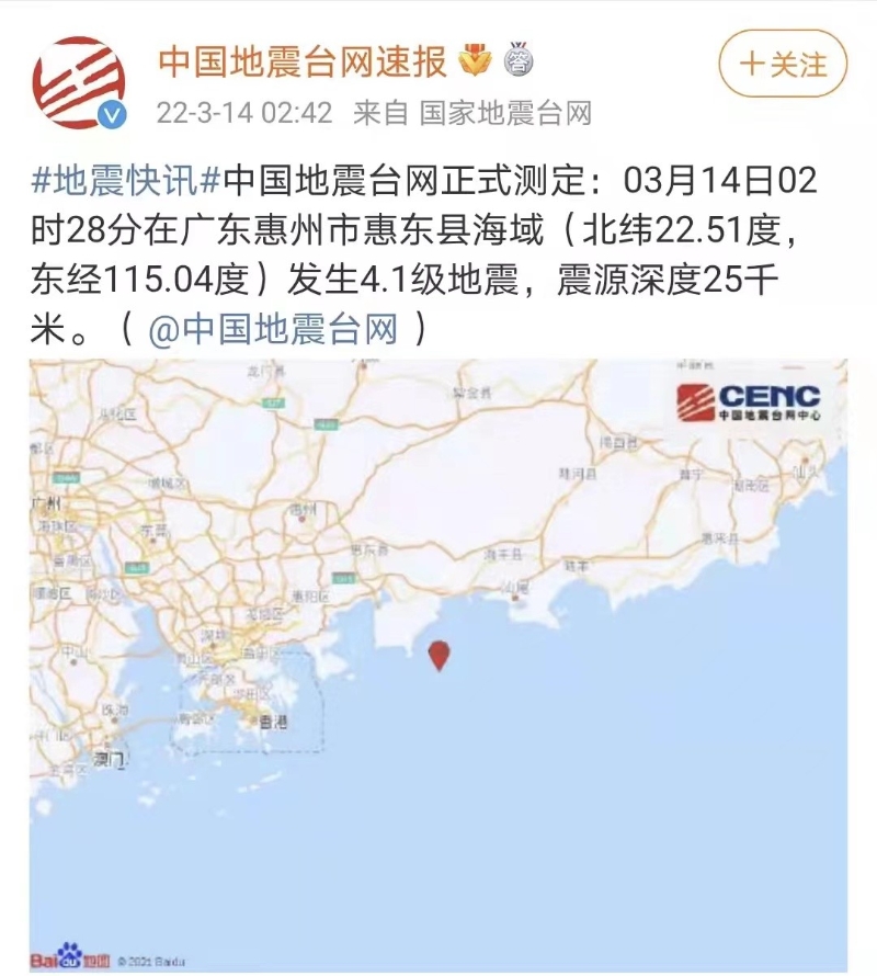 香港中通社3月14日電(記者 張明臻)中國地震台網14日凌晨錄得廣東省惠州市惠州縣海域發生4.1級地震,波及香港地區。部分港人表示有震感,雖未造成實質性損害,專家呼籲需關注可能由此引發的山體滑坡問題。