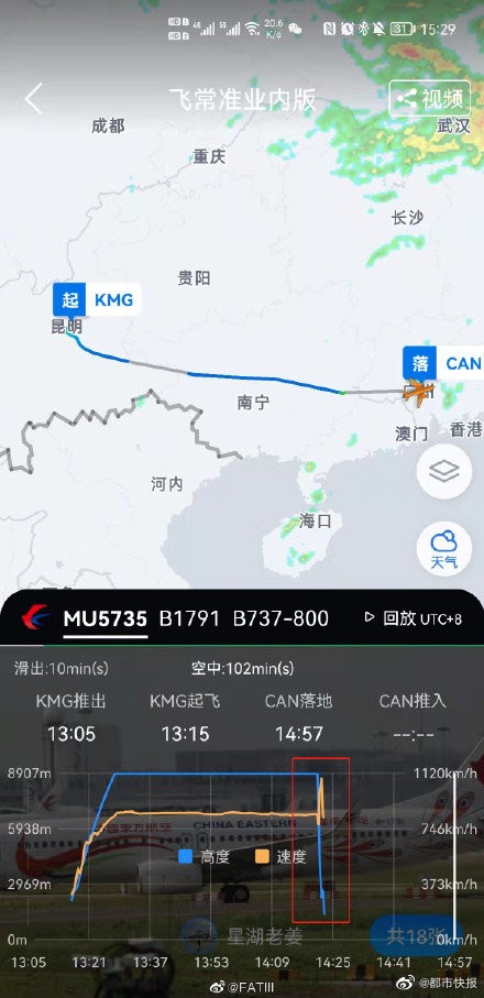 失事航班編號飛行狀態顯示 圖源:都市快報 據多個航空媒體微博:失事航班為東方航空MU5735,由昆明飛往廣州,目前根據Flightradar24顯示,速度和高度在梧州附近出現驟降。該客機是一架B737-800NG客機,註册號為B1791,機齡6.8年。 MU5735航班於當天13時許從雲南昆明起飛,原計劃15時抵達廣州白雲國際機場。