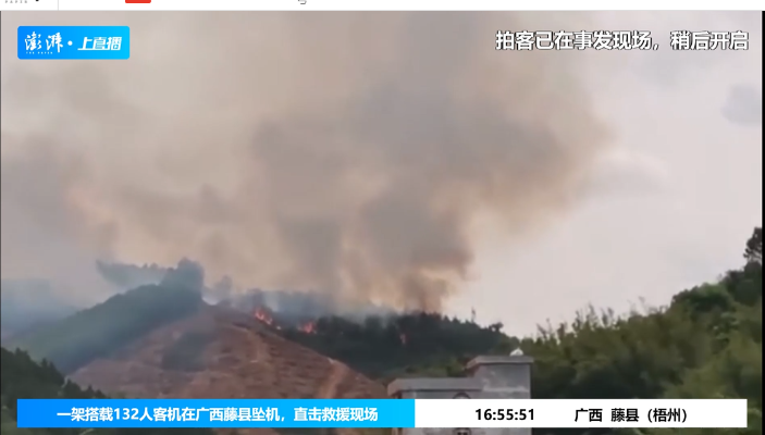 澎湃新聞墜機現場視頻截圖 另據廣西應急管理廳的消息,東航墜毀客機掉落在廣西梧州藤縣,并引發山火。目前救援隊伍已經集結正在靠近,傷亡情況未明。