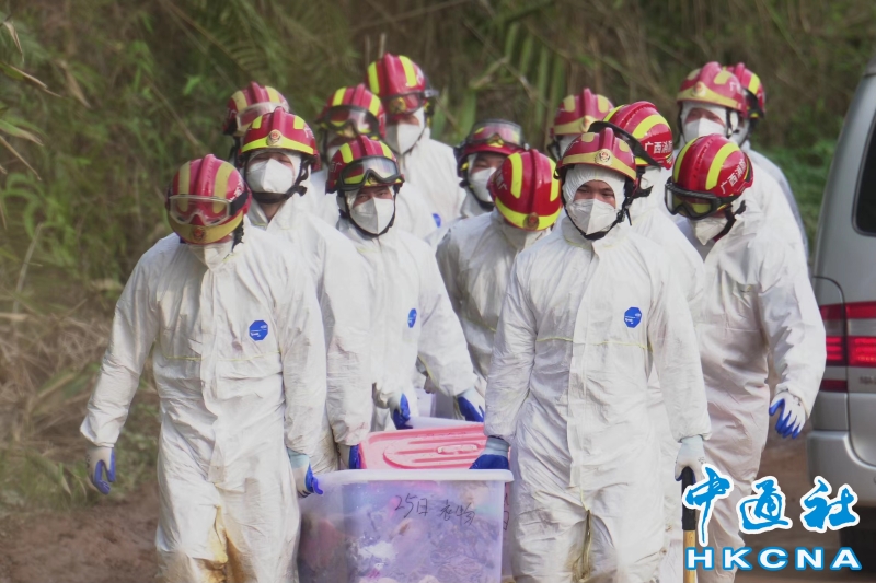 •   3月25日,廣西梧州市藤縣埌南鎮東航MU5735航班墜機事故現場,救援人員身穿防護服繼續搜救。 香港中通社圖片
