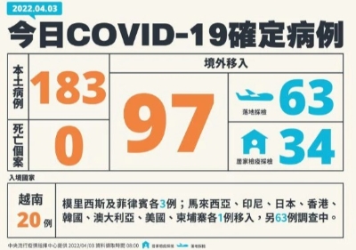 香港中通社4月4日電 台北消息:台灣流行疫情指揮中心4日通報,新增275例新冠肺炎確診病例,分別為133例本土病例及142例境外輸入病例。本土病例連續4天單日新增破百。