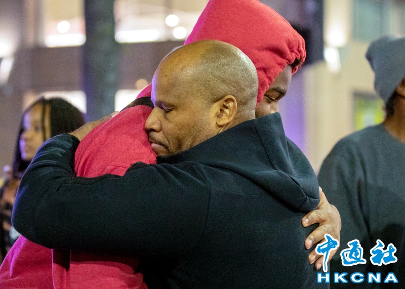 •   當地時間4月3日凌晨,美國加利福尼亞州薩克拉門托市中心發生一起槍擊事件,造成至少6人死亡,另有12人受傷。圖為當日晚,關注槍擊事件的人們在事發地附近路口擁抱。 香港中通社圖片