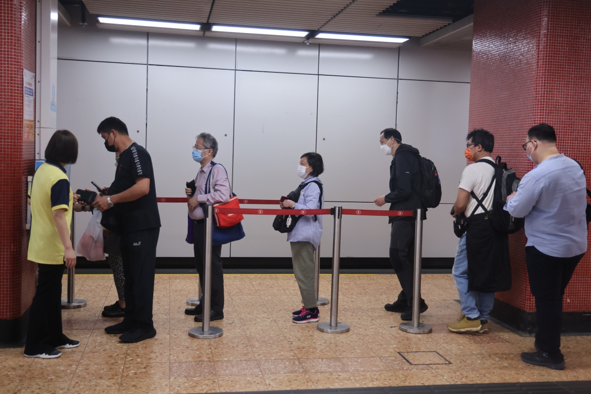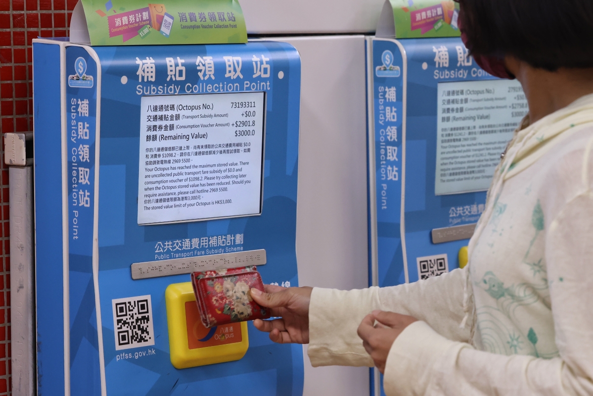 7日大批市民於地鐵站內領取消費券 香港中通社記者 許其皓攝 由於八達通儲值限額是三千元,市民要在消費後儲值額下降再拍卡領取八達通首筆消費券四千元,用完後最快可在下一個月的16日收到餘下的一千元消費券。有市民不清楚八達通會分兩期發放消費券,有港鐵職員在場解答市民查詢,也有市民認為局限了消費。