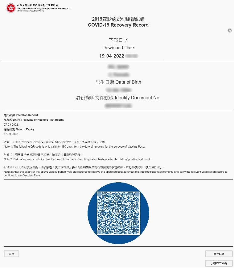 康復者19日起可透過電子疫苗接種及檢測紀錄系統下載,或“智方便”或“醫健通”應用程式下載“康復紀錄二維碼”。下載時須提供香港身份證號碼、出院或陽性檢測結果日期等,作身分認證。 “安心出行”應用程式更新,新版本已加入支援顯示醫學豁免證明書及康復紀錄。當局指出,“康復紀錄二維碼”在康復日期起計180天有效,市民可以選擇將“康復紀錄二維碼”和“疫苗接種紀錄二維碼”同時儲存在“安心出行”,康復者可以將“康復紀錄二維碼”設為預設顯示的“疫苗通行證”,方便進入處所。