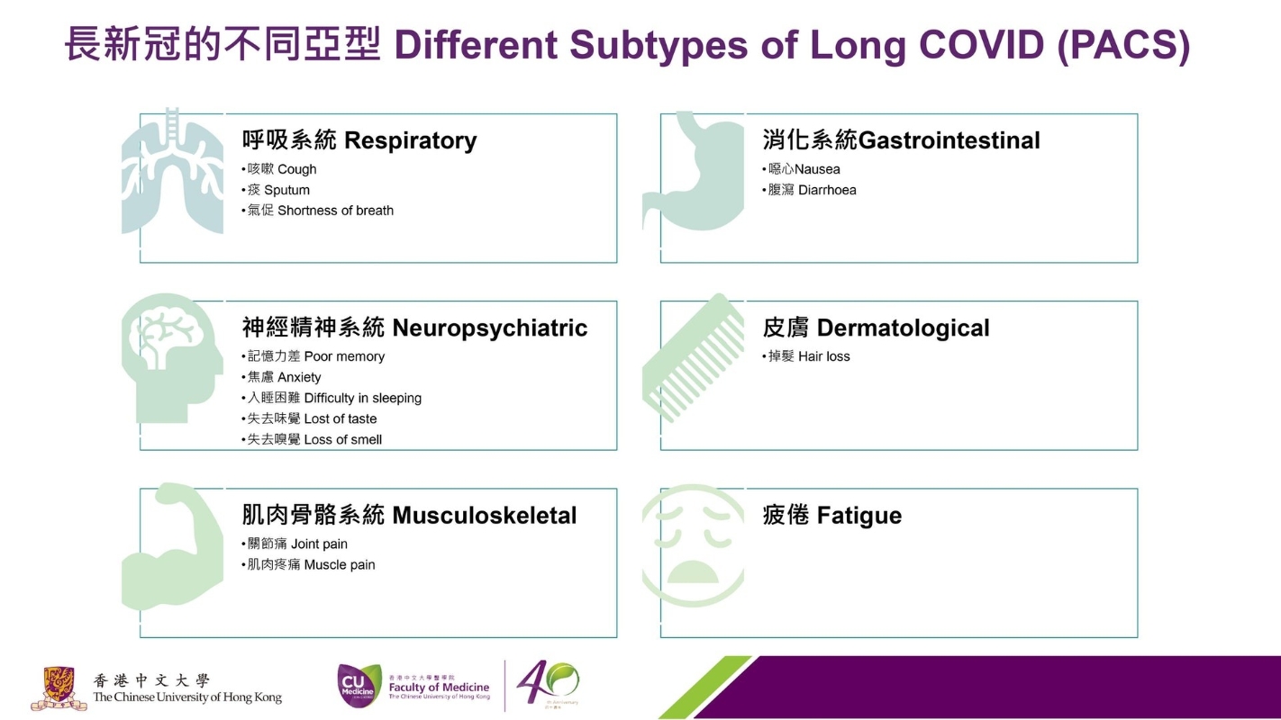 新冠長期後遺症症狀 香港中文大學製圖 綜合美媒、印媒20日消息,上述研究結論由美國加州大學洛杉磯分校(UCLA)研究人員得出,他們已將研究成果發表在《普通內科雜誌》上。2020年4月至2021年2月期間,共1038人接受調查,其中309人患上新冠長期後遺症。這309人中,最持久的症狀是疲勞和呼吸急促,以及喪失嗅覺。