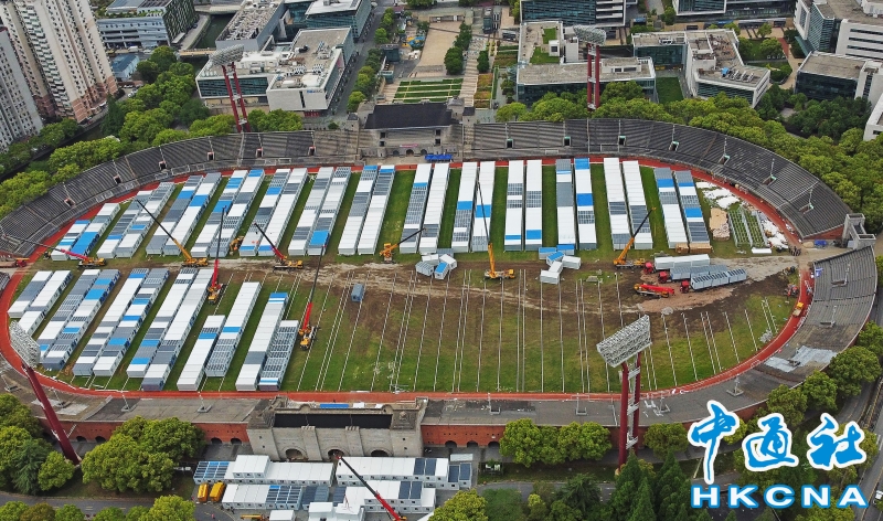•   正在改造中的江灣體育場。在4月30日舉行的上海市疫情防控工作新聞發布會上,上海市衛生健康委副主任趙丹丹表示,上海不斷擴大方艙醫院收治規模,改建一批體育館、會展中心等設施設備較好的公共建築作為方艙醫院,用於無症狀感染者和輕型病例的集中隔離醫學觀察。目前,上海市、區方艙醫院總開放床位約30萬張。 香港中通社圖片
