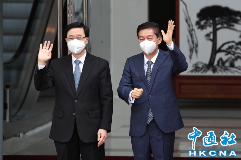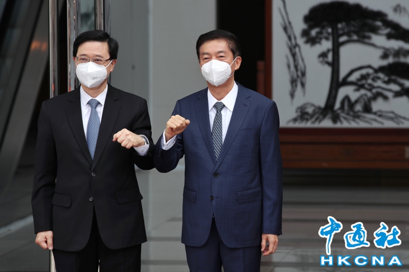 •   5月9日,第六任行政長官人選李家超(左)到訪中聯辦,中聯辦主任駱惠寧到場迎接。(香港中通社記者  謝光磊 攝) 香港中通社圖片