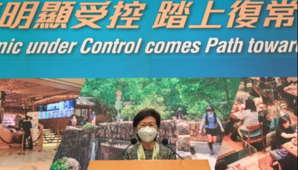 香港新聞網5月10日電 香港特區行政長官林鄭月娥10日在行會前見記者時表示,目前疫情較穩定,餘下50多天的工作繼續穩控疫情。當天,記者會上藍色的背景板寫著“疫情明顯受控,踏上復常路。”林鄭月娥指出,隨著社交距離的逐步放寬,社會反應正面。