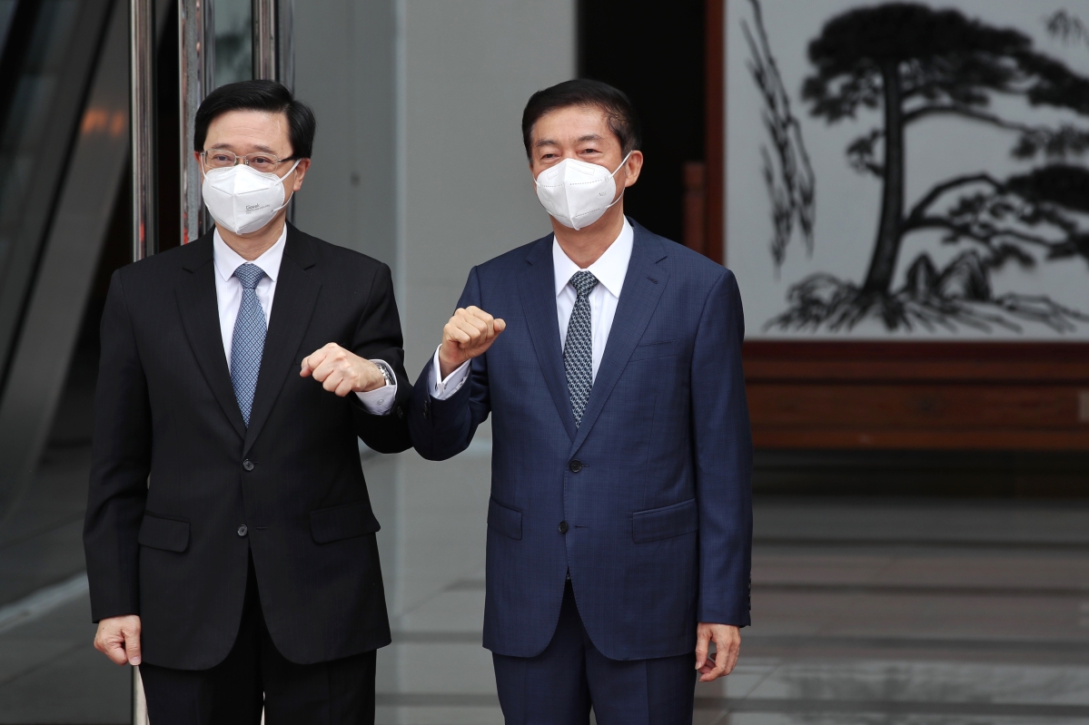 5月9日第六任行政長官人選李家超(左)到訪中聯辦,中聯辦主任駱惠寧到場迎接。 發言人指出,七國集團外長和歐盟高級代表無視自身國家民主制度的結構性缺陷,粗暴攻擊香港特區依法選舉地方首長和中國政府執行“一國兩制”政策,嚴重違反國際法和國際關係基本準則,其拙劣表演注定是徒勞的,必然成為不自量力的國際笑柄。此等所謂聲明,充滿傲慢和偏見,大搞無中生有,無視香港行政長官選舉過程依法依規、公平公正,無視選舉結果人心所向、眾望所歸,無視當前香港社會呈現團結向上的喜人氣象,蓄意對香港歷史和現實進行歪曲,其卑劣行徑只會讓人進一步看清其強盜式的雙標邏輯和“以港遏華”的險惡用心。 【編輯:王軼南】