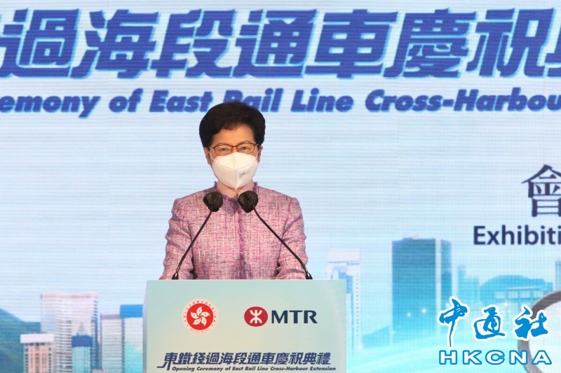 香港中通社5月14日電(記者 李明珠) 香港東鐵綫過海段將於15日正式通車,會展站是該線唯一的新建車站。香港特區行政長官林鄭月娥14日主持通車儀式時表示,東鐵線的策略定位將更重要,讓香港南北兩個都會區並駕齊驅,促進港深兩地進一步融合發展。 當日,過海段的通車慶典在會展站舉行,林鄭月娥從紅磡乘搭東鐵綫列車抵達會展站,並在通車儀式後,乘坐列車前往終點站金鐘站,體驗這條全長六公里的新建鐵路。 林鄭月娥表示,東鐵線過海段投入服務,標誌着超過一百年歷史的東鐵線將跨越維港,成為香港第四條過海鐵路。對於她這一輩香港居民來說,東鐵線蘊藏著集體回憶,見證香港鐵路一個世紀的蛻變。
