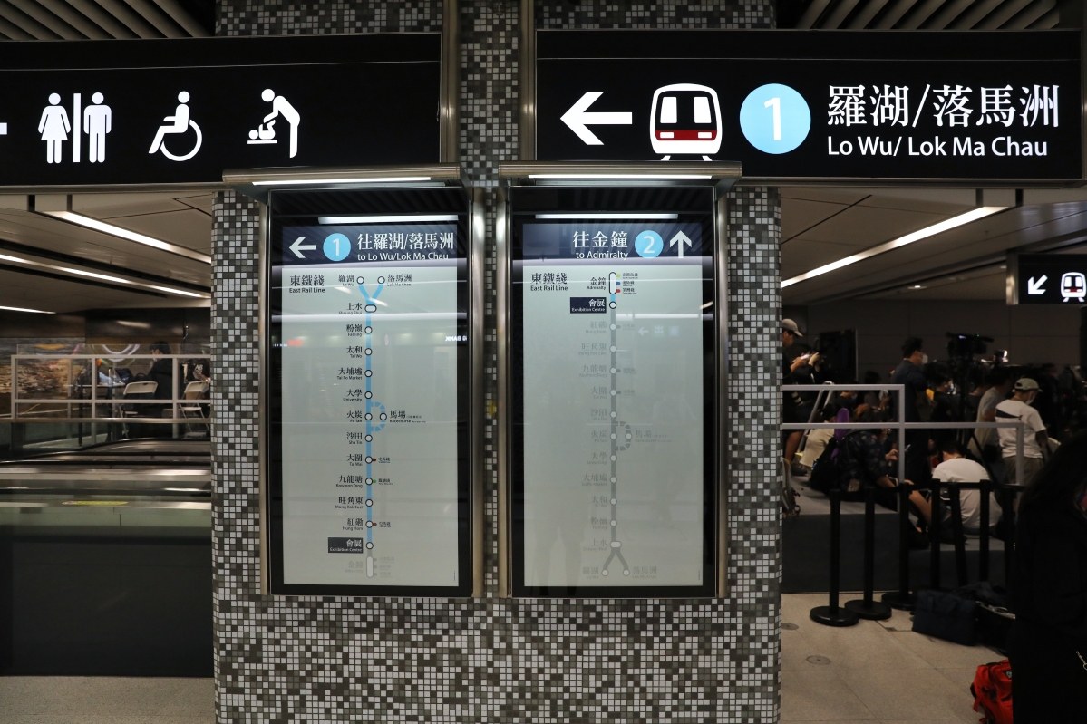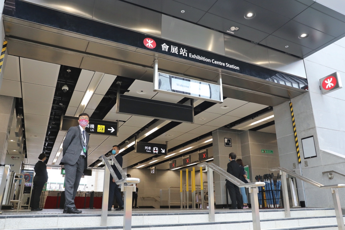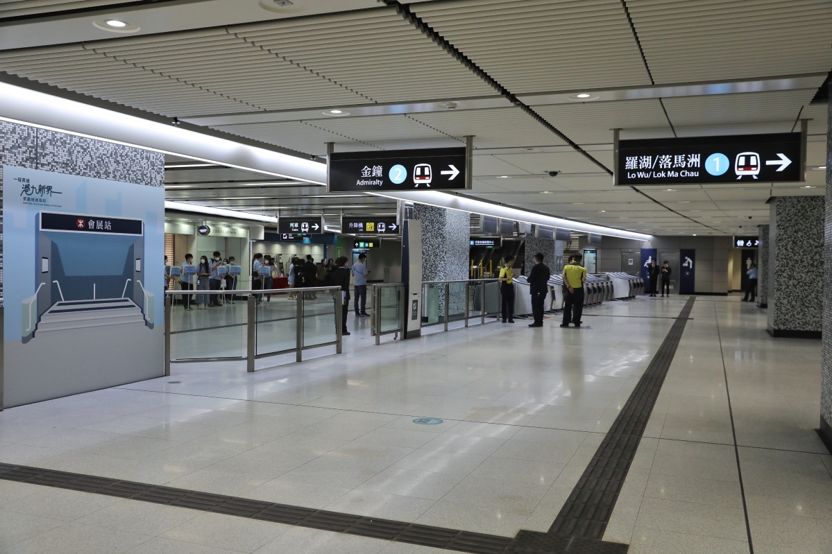 會展站大堂指示牌。香港中通社記者 謝光磊 攝 施工期間發現二戰留下炸彈 東鐵線過海段雖然只有短短的6公里,但施工期間克服不少難關。 在擴建金鐘站時,工程團隊須在營運中的港島線隧道下逐層挖掘岩石,深度達到地面以下大約50米,同時要確保現有列車服務不受影響。 因應不同地質狀況和施工環境,在短短6公里長的過海段隧道路段用上4種不同的隧道建造方法,而這亦為香港工程界創下一項紀錄。 在會展站施工期間,工地範圍內發現了三枚二次大戰留下的炸彈,須先後由警察爆炸品處理課到場拆除;其中一枚重達1000磅炸彈的彈殼現時展示於會展站月台,供市民參觀。 6公里的策略定位 在通車儀式上,特首林鄭月娥談到東鐵線的策略定位將更加重要:“它會將以國際金融中心為標誌的維港都會區,與我們建議建設國際創新科技中心的北部都會區緊密連接起來,達致香港南北兩個都會區并駕齊驅、互相輝映的願景,促進港深兩地進一步融合發展。”