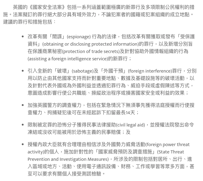 特區政府官網截圖 事實上,美西方國家一直戴有色眼鏡看中國及香港特區。對《香港國安法》的訂立及實施就不斷故意詆毀及作出失實指控,並將基本法第23條立法“妖魔化”。 鄧炳強的看法,顯然有“學你那套,你還會說什麼嗎”的用意。 英國的《國家安全法案》是怎麼規定的? 英國內政大臣11日向英國國會提交一份涵蓋範圍廣泛的《國家安全法案》,前身為《反國家威脅法案》,該法案匯集了重要的新措施,以進一步保護英國的國家安全,並使現有的反間諜法現代化以反映現代威脅。法案中特別提到間諜活動、外國對政治制度的乾預、破壞活動、發布虛假訊息、網路行動等源自外國的國家安全風險,更表明有關立法須“走在有關風險之前,在造成損害之前的更早階段進行逮捕”。