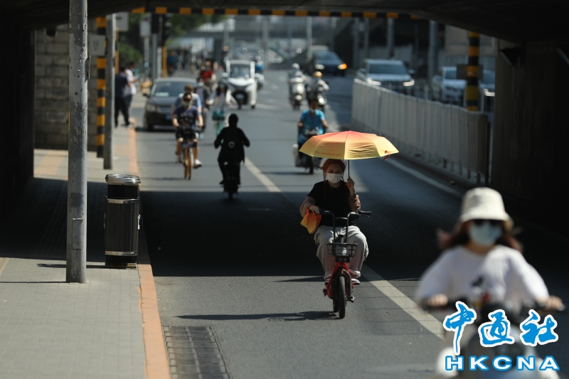 •   5月21日,北京迎來高溫天氣,市氣象台發布高溫藍色預警信號。圖為市民撐傘出行。 香港中通社圖片