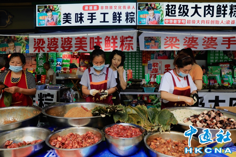 •   5月23日,端午節臨近,位於成都市成華區的“粽子一條街”粽香彌漫。每逢端午前後,該街兩邊店鋪會售賣各種口味的粽子。圖為一家店鋪的店員正在包粽子。 香港中通社圖片