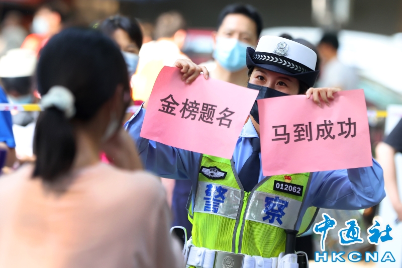 •   6月6日,江蘇省南京市一高考考點,一名交警舉著標語向考生送祝福。 2022年全國高考將於6月7日開考,共1193萬學子報名,比去年增加115萬。 香港中通社圖片