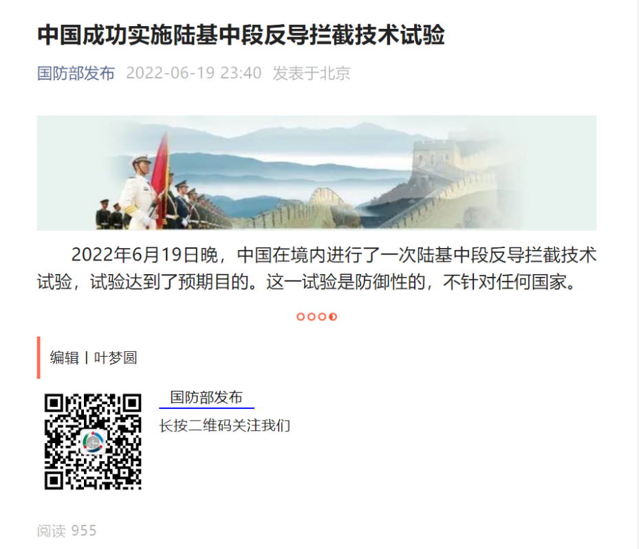 據中國國防部網站消息,2022年6月19日晚,中國在境內進行了一次陸基中段反導攔截技術試驗,試驗達到了預期目的。這一試驗是防禦性的,不針對任何國家。(完)