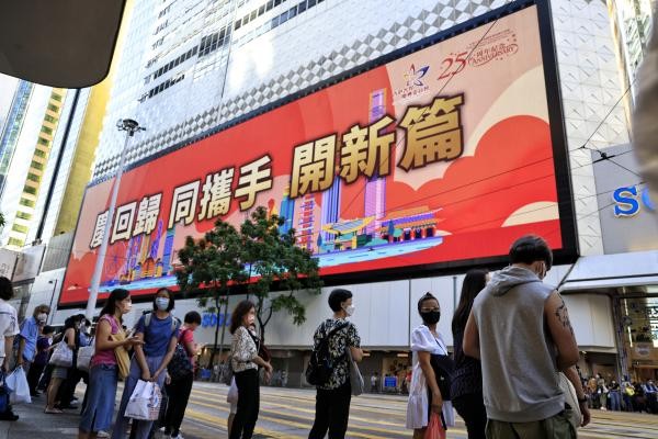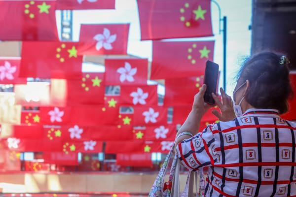 香港中通社圖片 “當然很開心,好久沒有看到這麼大規模的活動了。”住在觀塘區的黃小姐表示,疫情以來,許多節日都沒能好好慶祝,“回歸紀念日是香港的大日子,希望今年是個新開始。”她期待“七一”當日,帶同家人到海濱花園感受氣氛,遊覽“打卡”。 另一邊,逾百面中華人民共和國國旗和香港特區區旗在灣仔利東街迎風飄揚;新界等區更架設了傳統大型花牌,同慶同樂。一片火紅的鬧市之中,巴士、電車車身張貼出“慶香港回歸祖國25周年”等廣告字樣,穿梭於大街小巷。