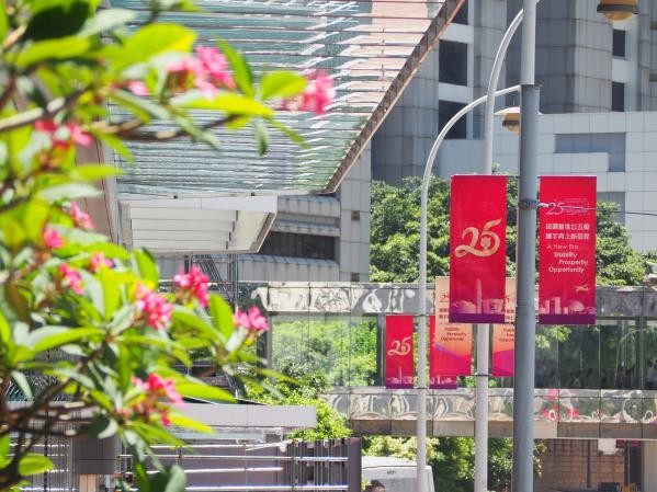 香港中通社6月24日電(徐嘉儀) 香港回歸祖國25周年紀念日將至,各界連日來推出豐富多樣的慶祝活動,大街小巷“換新裝”,四處洋溢著喜慶氣氛。 走過香港街頭,隨處可見慶祝“香港特區成立25周年”的海報和橫幅,路燈杆也換上了新彩旗。九龍東區各界聯會展開“十全十美慶回歸”系列活動,觀塘海濱花園將一連5日化身藝文“大笪地”,一幅長30米高11米的巨型3D藝術畫將躍然海上,畫中是吉祥物母子“咚咚龍”,寓意國家與香港感情深厚、共同繁榮。屆時,中國風特色船“東龍號”將接載市民暢遊維港,歡聚打卡。
