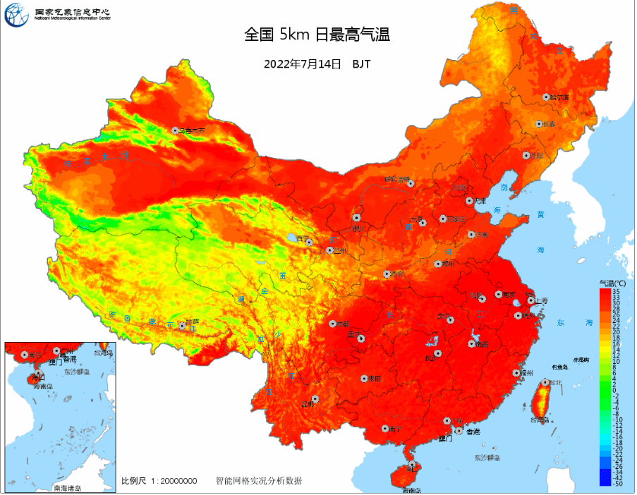 7月14日全國最高氣溫分佈 圖源:國家氣候信息中心 極端高溫天氣影響9億人 還將持續一個月 進入7月,夏季高溫強勢來襲,中國多地進入持續極熱天氣,特別是南方地區正在經歷今年以來最漫長的高溫,中央氣象台連續多日發佈高溫橙色預警。國家氣候中心監測顯示,今年6月13日以來,中國出現了今年首次區域性高溫天氣過程,至今高溫事件已持續32天,覆蓋國土面積達502.1萬平方公里,影響人口超過9億人。