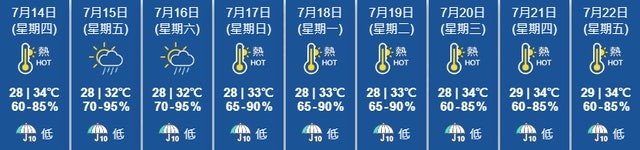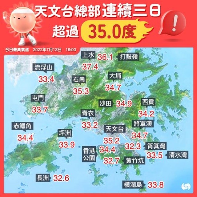 香港天文台Facebook截圖 天文台表示,自有紀錄以來,過往本港只試過兩次連續三日或以上錄得超過35度,分別是2016年6月連續四日,以及1963年橫跨5、6月的連續三日。根據預測,天文台料周日(17日)起連續六日酷熱,市民要慎防中暑。
