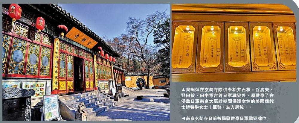製圖:文匯報 2017年12月18日,吳啊萍到玄奘寺要求供奉牌位,并在登記表上填寫“松井石根、谷壽夫、野田毅、田中軍吉、向井敏明、華群(美國人明妮·魏特琳)”6人名字。據吳啊萍供述,她移居南京後瞭解到侵華日軍戰犯的暴行,產生心理陰影,長期被噩夢纏繞,還曾因失眠、焦慮等症狀,先後3次到醫院就診。從2017年3月起開始服用鎮靜催眠藥物。接觸佛教後,產生了通過供奉5名侵華日軍戰犯“解冤釋結”的想法。同時了解到美國傳教士魏特琳女士在侵華日軍南京大屠殺期間保護女性的善舉,因受戰爭刺激,回國後在家中自殺,想通過供奉幫其解脫。