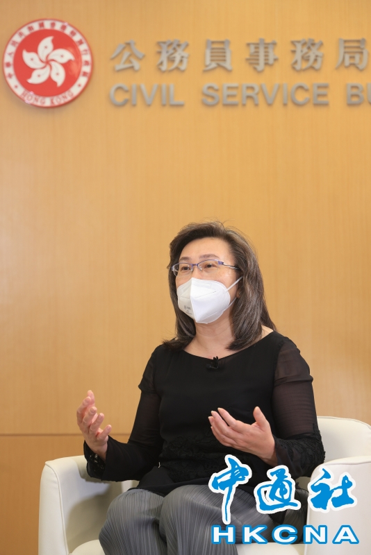 •   香港特區政府公務員事務局局長楊何蓓茵上任滿月,她接受香港中通社專訪時堅定表示,香港公務員應強有力講好中國故事,講好香港故事,講好“一國兩制”的故事。(香港中通社記者 許其皓攝) 香港中通社圖片