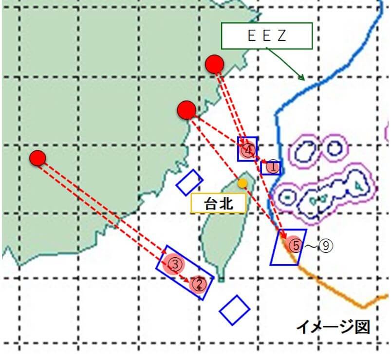 東部戰區公佈導彈發射畫面 台防務部門4日傍晚發布新聞稿稱,解放軍於當日下午分數波次向台灣北部、南部及東部周邊海域,發射11枚東風系列彈道導彈。不過新聞稿中並未提到導彈穿越台島上空,也未因此發布防空警報。 日本防衛省4日晚間公布消息稱,推定解放軍在當日下午2時至3時左右,從內陸朝台灣方向發射9枚導彈,5枚落入台灣東部海域,推定其中4枚飛越台灣上空。