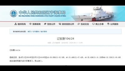 香港新聞網8月14日電 據中國海事局網站14日消息,大連海事局、防城港海事局發佈航行警告,將在渤海和北部灣特定海域執行軍事任務,禁止駛入。 據大連海事局消息,渤海海峽黃海北部,自8月14日16時至28日16時將執行軍事任務。禁止駛入。