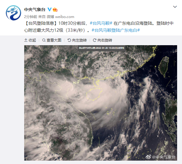 中央氣象台微博截圖 廣東省氣象台預計,“馬鞍”以25公里左右的時速向西北方向快速移動,穿過茂名,25日下午進入廣西,強度逐漸減弱。受“馬鞍”影響,25日、26日兩天,廣東、廣西、海南、雲南等地將出現明顯風雨天氣,相關部門及公眾需警惕中小河流洪水、城鄉積澇等次生災害的發生。 【編輯:王軼南】