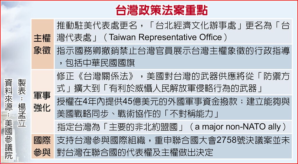 製圖:中時新聞網 法案提案人之一的梅南德茲13日稱,相關法案並沒有改變美國對台灣政策,但會更清晰表明華府幫助台灣的意願。國台辦發言人朱鳳蓮14日上午也在例行記者會上表示,台灣問題純屬中國內政,美國國會議員炮製涉台議案嚴重違反一中原則,中方堅決反對。 《台灣政策法》是由美國參議院外委會主席、民主黨籍參議員梅南德茲與共和黨籍參議員葛蘭姆共同提出,共分三大篇、九大主題,以增補現行《台灣關係法》為基礎,並承襲美國對台“六項保證”精神與規定。它雖明示立法前提無涉與台灣恢復外交關係,但包含促進台灣安全、確保區域和平穩定,以及遏制中國大陸對台侵略等文字躍升紙面,法案甚至言及一旦北京對台採取“敵對行動”,美國將祭出嚴厲制裁。有評論指,相關文字是“40多年來美國對台政策最清晰的法律表達”。 中國社科院美國研究所研究員劉衛東14日接受香港中通社記者採訪時分析指,拜登政府作為政策執行機構,不願過度刺激中國政府、將中美關係完全帶入嚴冬,而希望根據不同議題與華展開合作、競爭與對抗。 “‘台灣政策法’確實是美國對台政策的巨大突破,是一種里程碑式的改變。”劉衛東直言,中美對於美對台政策解釋不一,單純從美國角度來看,真正需要回避的僅有一條,即支持台灣實現法理“台獨”。但從中國立場來看,任何對原有限制的突破,都是向追求法理“台獨”的方向上行進。 “2022年台灣政策法”目前還沒有眾議院版本。在美國,一部議案若要送交總統簽署成法,必須在參眾兩院的相關委員會過關,並分別由兩院全院通過文字相同的版本。法案能否順利走完後續程序? 對此,劉衛東分析,拜登政府如果到最後否決法案,會給對手造成明顯的攻擊目標,對民主黨整體競選形象不利,因此會盡量在法案出台前做工作,對法案中過於挑釁的條款,降低一些調門。另外,法案在參議院通過後,還要遞交眾議院審議,而眾議院對白宮意見較尊重,拜登會與之協調。最終結果或與參議院版本不同。”(完) 【編輯:王軼南】