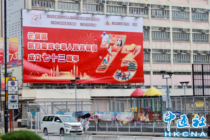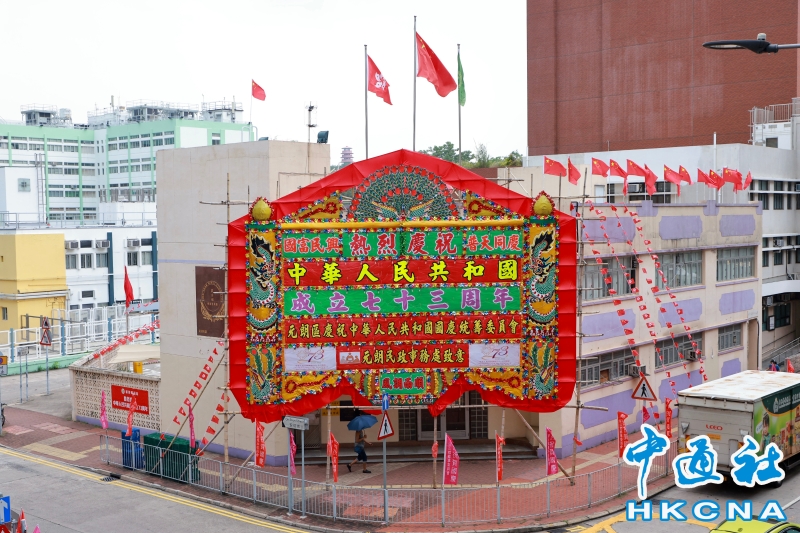 •   9月20日,香港屏山鄉鄉務委員會。國慶臨近,香港氣氛逐漸濃烈,街頭隨處可見慶祝中華人民共和國成立七十三周年的標語,一片喜慶祥和。(香港中通社記者張海德攝) 香港中通社圖片