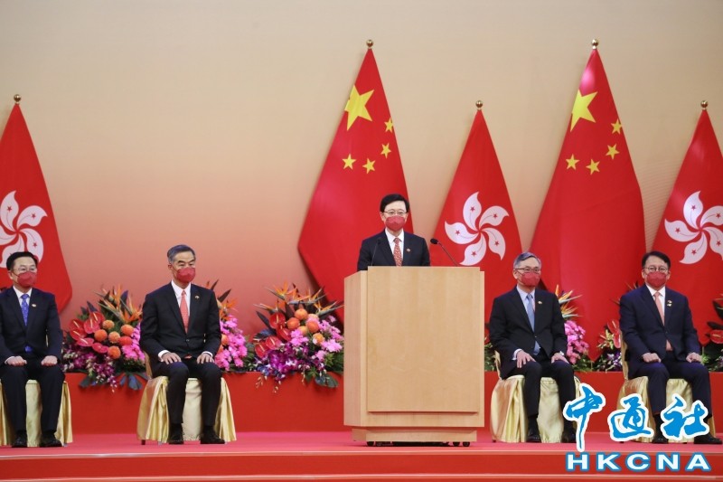 香港中通社圖片 今年也是香港回歸祖國25周年。李家超說,香港取得驕人成績,雖然也經歷了不同挑戰和考驗,但是總能轉危為機,主要原因是“一國兩制”為香港長期繁榮穩定提供了最佳制度保障。 李家超表示,香港不論在開拓機遇,以至抵禦衝擊每一個關鍵時刻,總有祖國作為堅強後盾。過去兩年,中央頒布實施香港國安法,完善特區選舉制度,落實“愛國者治港”,令香港由亂到治。今年初,香港面對嚴峻疫情,中央全力支援香港抗疫,使疫情最終受控。這些護港情切的“中國速度”和民族關懷,每個香港人都歷歷在目。 李家超表示,習主席7月1日的重要講話,成為了特區政府的施政藍圖。他會帶領團隊竭盡所能,實踐主席的希望和要求,不負所託。目前,香港現正經歷由治及興的關鍵期,他對香港的前景充滿信心,施政報告籌備工作亦進入最後階段。 前路不乏挑戰,但李家超深信“謀度於義者必得,事因於民者必成”,他和團隊必定不忘初心;他亦呼籲大家為實現中華民族偉大復興作出貢獻。 最後全體嘉賓起立,一起祝福祖國繁榮昌盛。 【編輯:李泺】