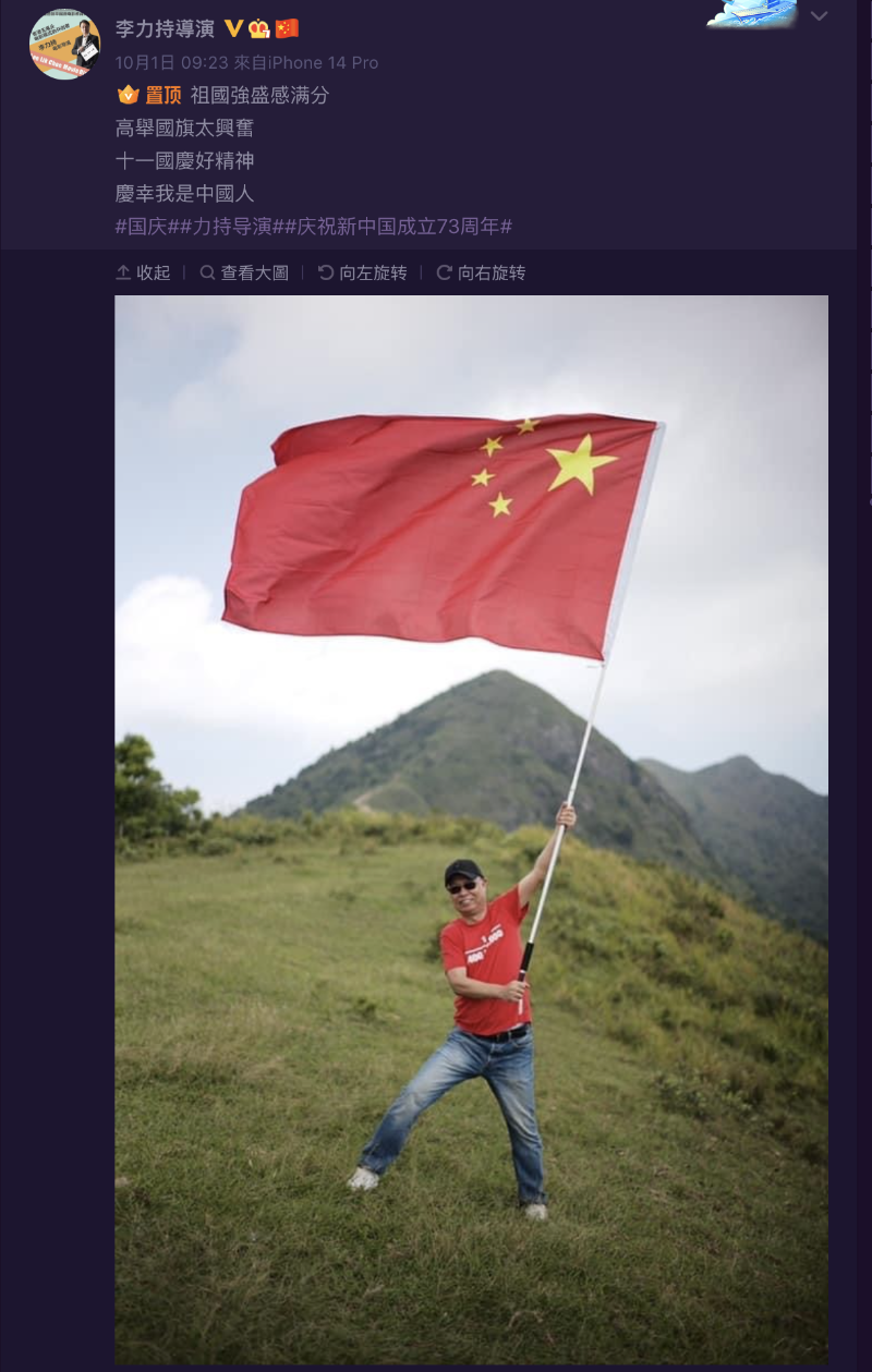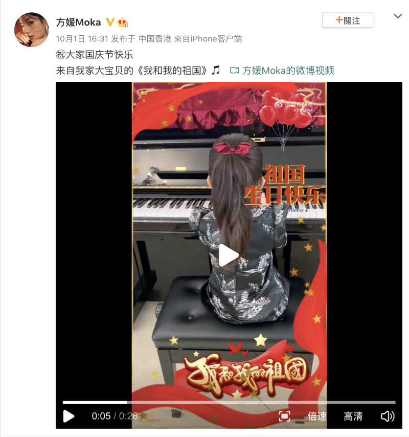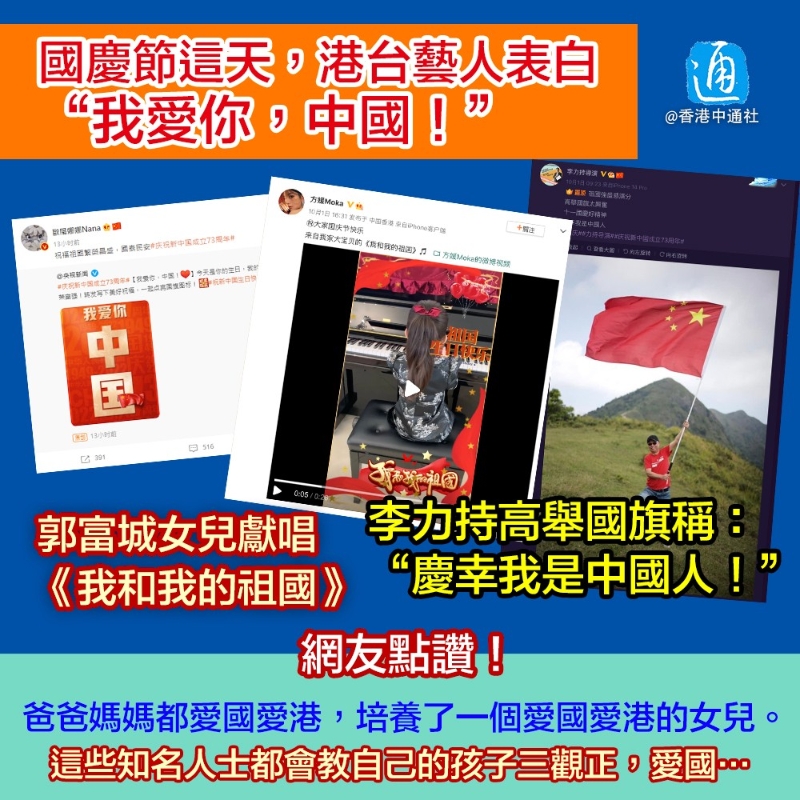 從方媛上傳的影片可見,小姑娘身穿黑色旗袍,馬尾上綁了一個紅色蝴蝶結。她乖巧地坐在鋼琴前,對著手機屏幕上的歌詞演唱。雖然只有5歲,但唱起《我和我的祖國》時卻聲音響亮,普通話發音也很標準,被不少網友盛讚完美遺傳了父親郭富城的音樂細胞。 “高音部分完美呈現!”一些網友讚其深得父親遺傳、天生就有好歌喉,“小歌唱家,跟她爸爸一樣唱歌好聽。” “爸爸媽媽都愛國愛港,培養了一個愛國愛港的女兒。”也有網友肯定郭富城及方媛注重下一代的愛國教育,稱“這些知名人士都會教自己的孩子三觀正,愛國……” 至於引發討論的郭富城女兒的普通話標準一事,有網友就在留言區補充稱,“香港小學生學普通話,我在香港的時候,鄰居小孩不管是本地人還是白人,都是普通話、粵語及英語無縫切換,(他們)還會很多普通話的兒歌,播音腔那種,特別有意思。” 就在郭富城女兒代表全家為祖國送上生日祝福之際,多位香港藝人亦在同一天為祖國慶生。 香港導演李力持在微博上載一張身穿紅衣、高舉國旗的照片,興奮地表示,“祖國強盛感滿分,高舉國旗太興奮,十一國慶好精神,慶幸我是中國人!”