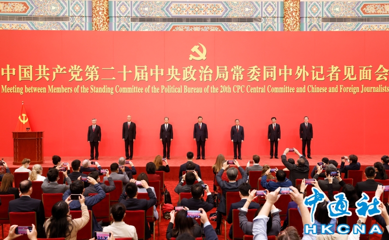 •   10月23日,剛剛在中國共產黨第二十屆中央委員會第一次全體會議上當選的中共中央總書記習近平和中共中央政治局常委李強、趙樂際、王滬寧、蔡奇、丁薛祥、李希在北京人民大會堂同中外記者親切見面。 香港中通社圖片